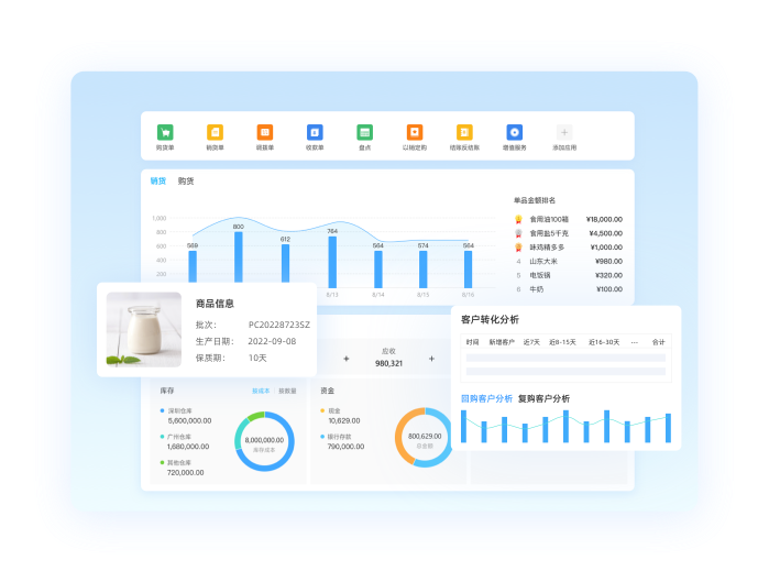 - 智能分析:客户分析、商品分析、销售分析、采购分析、资金分析等,洞察企业全方位状况