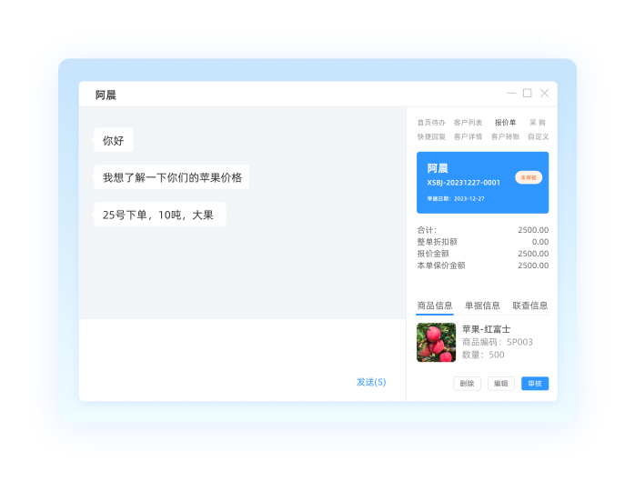- 开通企微互通服务后,可以实现企微客户一键同步到云星辰;在企微跟客户沟通时,能在侧边栏查看客户资料、客户账单,实现一键新增客户、一键写跟进、一键报价、一键下单、一键客户对账。