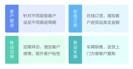 - 针对不同层级客户设置不同跟进周期,支持在线订货、移动访销、移动车销多种模式,满足各种不同场景