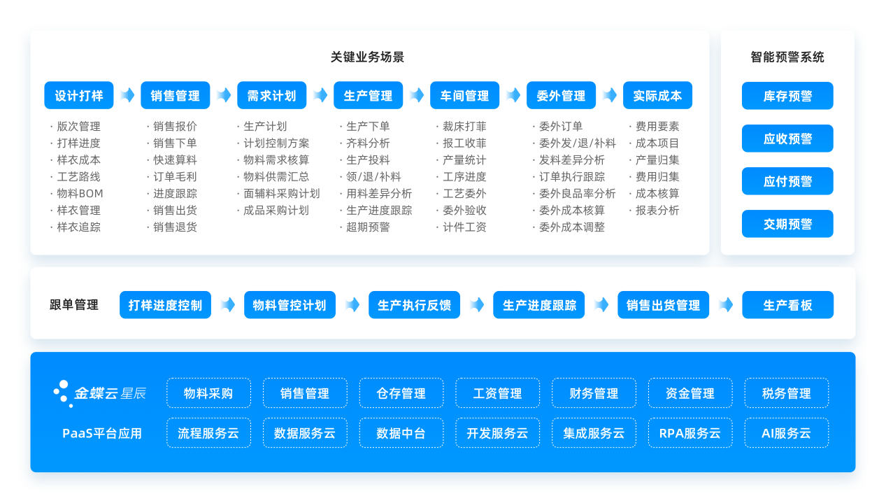金蝶云・星辰X云蝶轻智造【服装专版】,打通服装设计与生产流程,实现车间精细化管理,使服装企业的供应链管理更敏捷、更高效