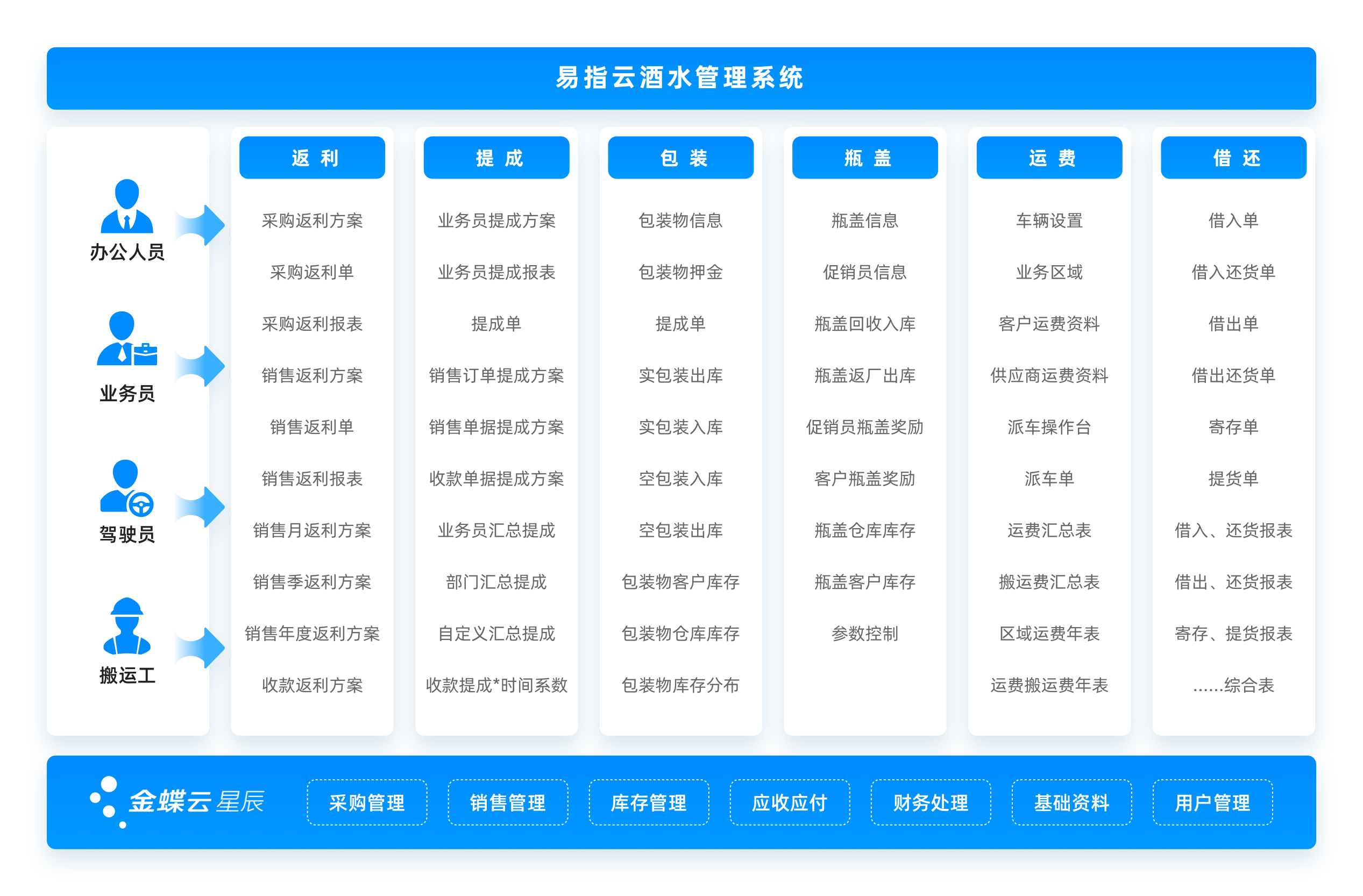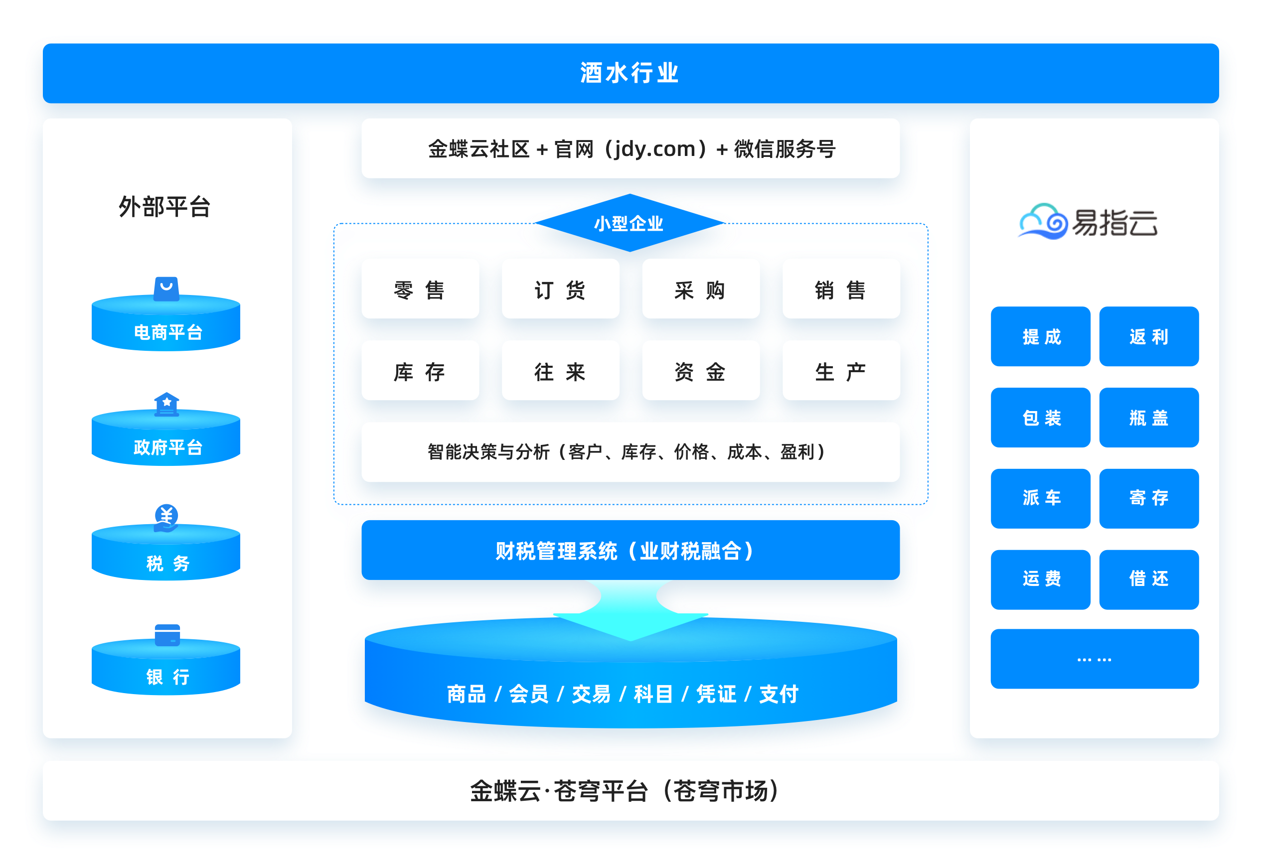 金蝶云·星辰x易指云,建立多角色信息共享平台,从数据-决策-业务-执行-落地,帮助酒水企业实现业财税+特性一体化,助力企业提升精细化运营管理能力